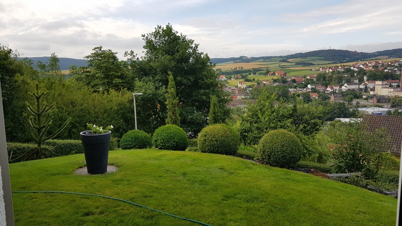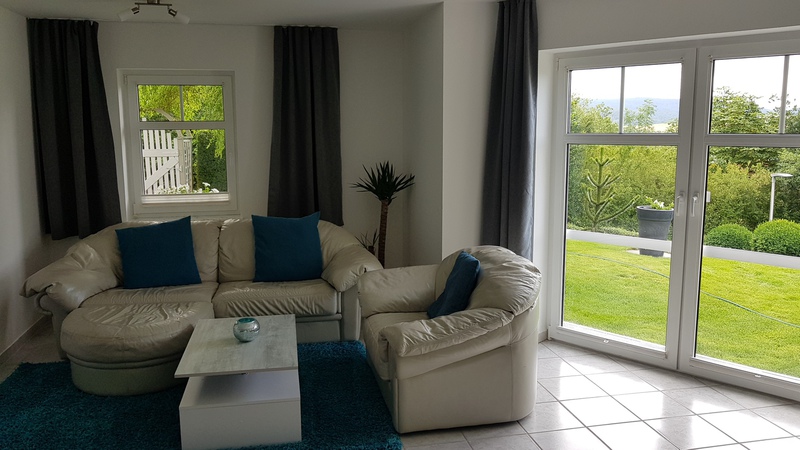 Die Ferienwohnung im Erdgeschoss des Gebäudes umfasst ein Schlafzimmer mit einem Doppelbett, einen Flur, ein Bad, eine Küche, einen Abstellraum sowie ein großes lichtdurchflutetes Wohnzimmer (ca. 30 qm) mit bodentiefen Fenstern und Blick runter ins Tal von Bad Wildungen. Vor der Wohnung (Bild oben) befindet sich für Sie ein kleiner Freisitz als Terrasse (Gartennutzung nicht enthalten).